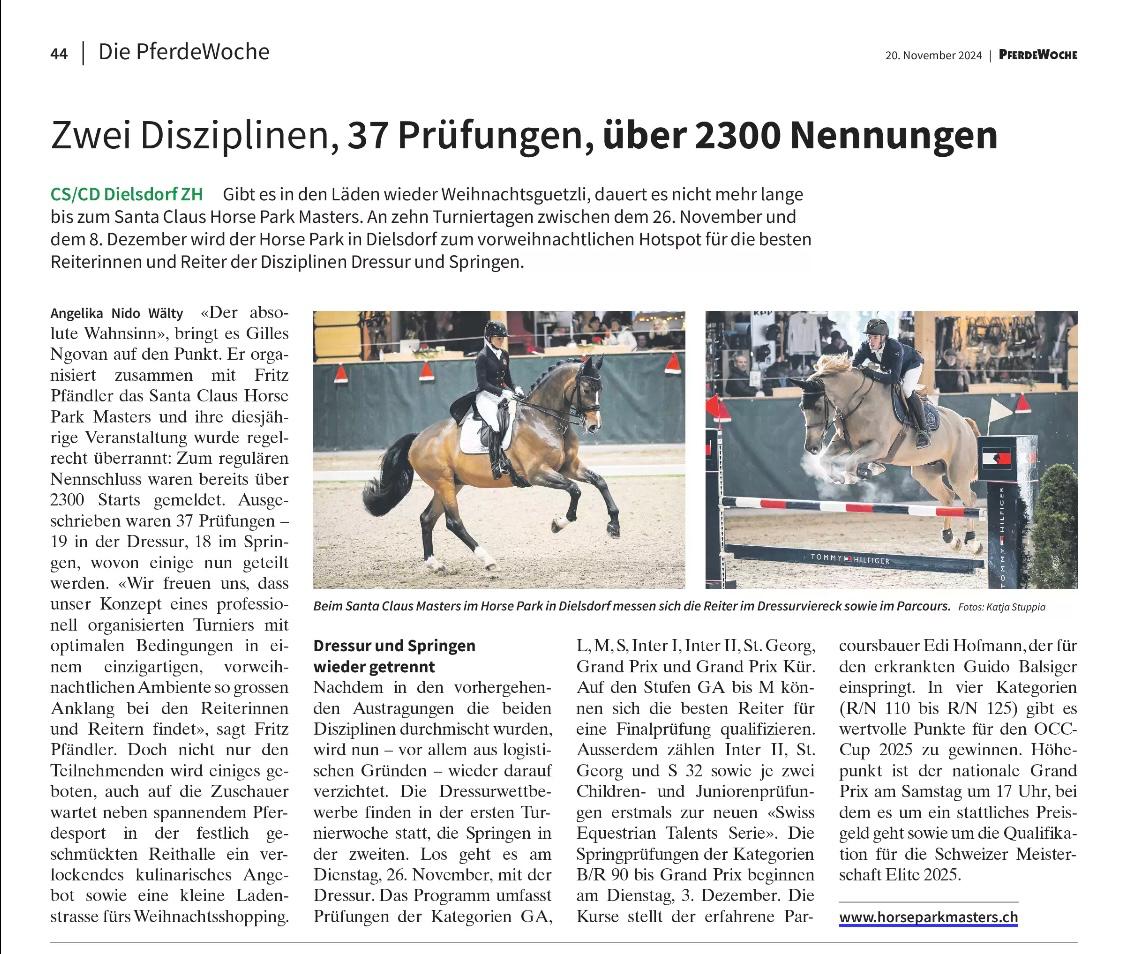 (ani) «Der absolute Wahnsinn», bringt es Gilles Ngovan auf den Punkt. Er organisiert zusammen mit Fritz Pfändler das Santa Claus Horse Park Masters und ihre diesjährige Veranstaltung wurde regelrecht überrannt: Zum regulären Nennschluss waren bereits über 2300 Starts gemeldet. Ausgeschrieben waren 37 Prüfungen – 19 in der Dressur, 18 im Springen, wovon einige nun geteilt werden.