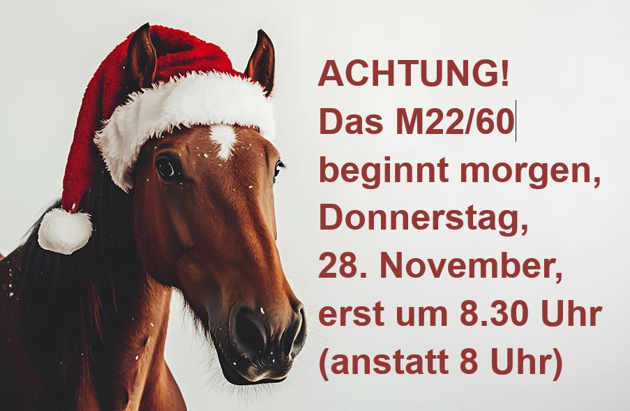 ACHTUNG! Das M22/60 beginnt morgen, Donnerstag, 28. November, erst um 8.30 Uhr (anstatt um 8.00 Uhr) Beitragsnavigation Vorheriger Artikel Vorheriger Artikel Das L14 gewinnt Markus Graf vor Ramona Schmid und Véronique Streulet Nächster Artikel Nächster Artikel Euren schönsten Momente – auf einem Turnierfoto von Sportfoto Mo Das könnte Dich auch interessieren Der Dank des OKs Uncategorized Heute in der PferdeWoche Uncategorized Einen Kommentar hinterlassenDu musst angemeldet sein, um einen Kommentar abzugeben.