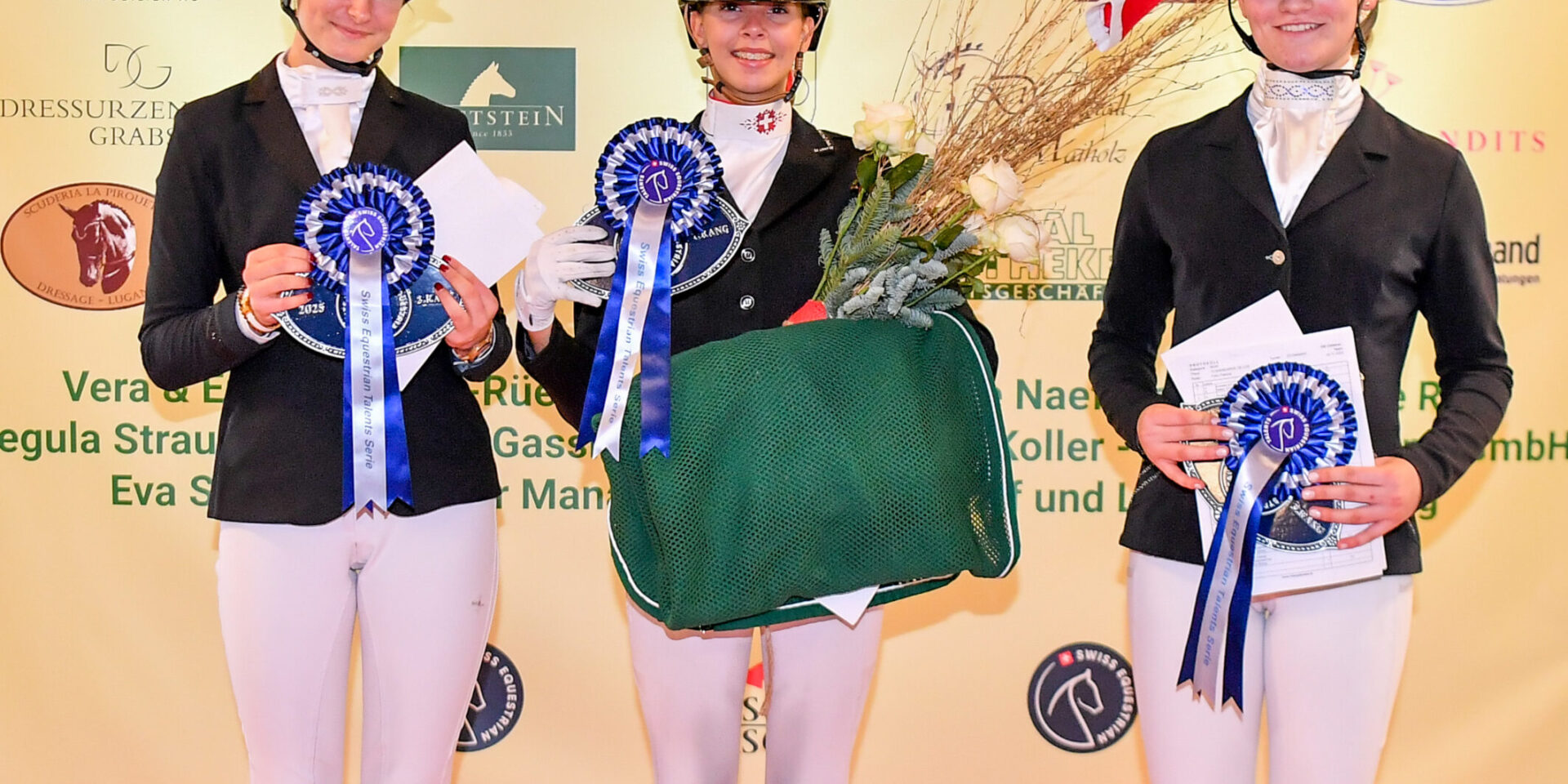 Die Dressuraufgabe FEI Children Team stand für die jungen Teilnehmerinnen im Preis der Mü. Pa. Beratung GmbH, Hitzkirch, auf dem Programm. In dem siebenköpfigen Starterfeld war es die amtierende Schweizer Meisterin der Children, Amelie-Charlene Finkeldei aus Illighausen, die mit ihrem 9-jährigen Fitch Unstoppable KWG CH erneut für Aufsehen sorgte: der elegante Dunkelbraune aus Schweizer Zucht und seine Reiterin tanzten zu tollen, 77,98%, dem bisher höchsten Ergebnis am diesjährigen Santa Claus Horse Park Masters. Der 2. Rang ging an Noemi Kempf, Altendorf, der mit Fürst Alexander TM CH ein ebenfalls sehr schönes Programm gelang, das mit 73,64% belohnt wurde. Fast gleichauf, mit nur einem Zehntel eines Punktes Rückstand, wurde Patrizia Föhn aus Schwyz mit Avangarde de Lus Dritte (73,62%). Der 4. Rang ging an die Bronzemedaillengewinnerin der SM, Linda Küng, Entlebuch, mit Fifty Cent d’Arx (67,68%) vor Christy Hefti, S. Antonio, mit Suntory (64,58%) uns Georgina Bisang, Küsnacht, mit ihren beide Pferden Caecilius AD (63,52%) und Rondouia (55,16%).