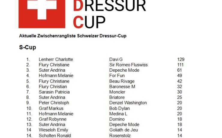 Nach Balsthal, der sechsten von acht Qualifikationen im neuen Schweizer Dressur Cup führt in der Kategorie L Corinne Rapold mit ihrem beiden Pferden Morrison Blue ZS CH (170 Punkte) und Fürst Anton (126) vor Brigitta Schmidig mit Zaphira (110). Für den grossen Final, der am
