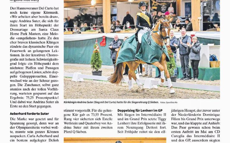 Sechs Hindernisse mit sieben Sprünge in der ersten Phase und weitere fünf Hindernisse mit sechs Sprüngen in der zweiten Phase umfasste das erste RN120 des heutigen zweiten Springtages am Santa Claus Horse Park Master, der Preis der Weinlandmühle Trüllikon Glanzmann AG, Trüllikon. In dem vollen