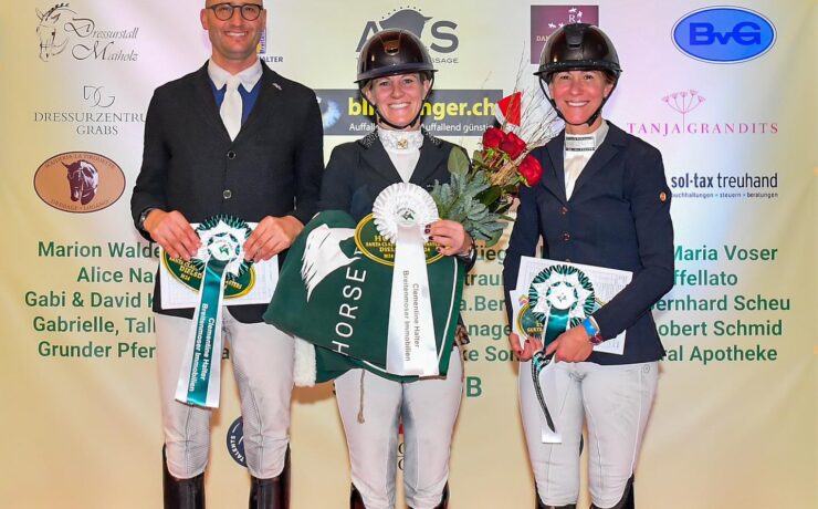 Nach dem Sieg im Inter II und den ersten beiden Plätzen im Grand Prix gewann Charlotte „Tiggy“ Lenherr am Samstagmorgen auch das S32/60, den Preis von Isabelle Ros, Erlenbach. Sie sass dabei im Sattel des 9-jährigen Füstenball-Sohns Fürst Lauries, mit dem sie tags zuvor im