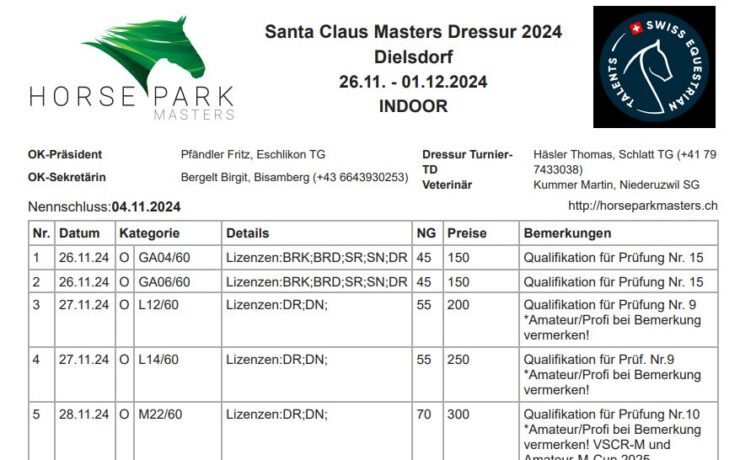 Gibt es in den Läden wieder Weihnachtsguetzli, dauert es nicht mehr lange bis zum Santa Claus Horse Park Masters. An zehn Turniertagen zwischen dem 26. November und dem 8. Dezember wird der Horse Park in Dielsdorf zum vorweihnachtlichen Hotspot für die besten Reiterinnen und Reiter