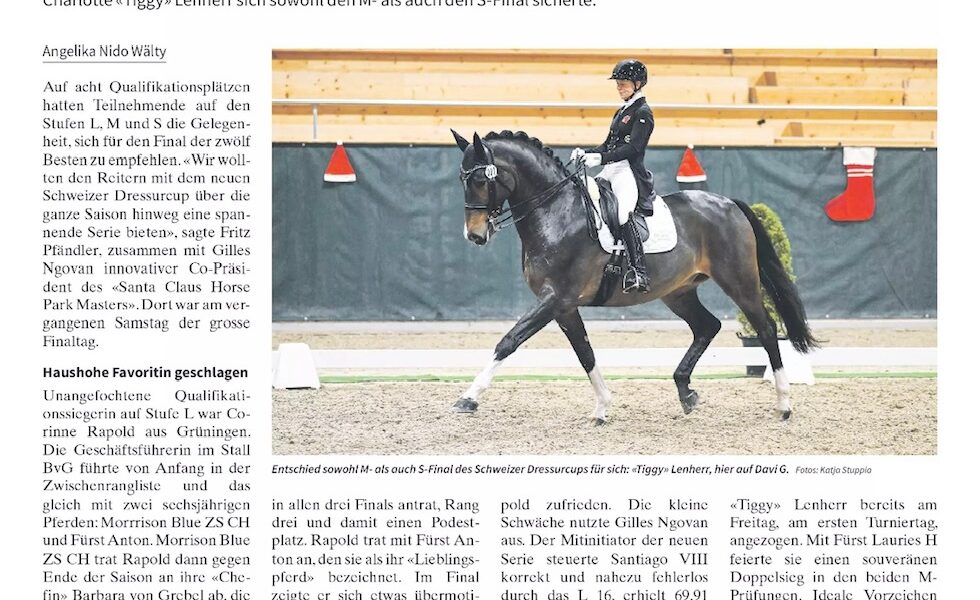 Unser Medienpartner, die PferdeWoche, berichtet in ihrer heutigen Ausgabe vom ersten Turnierwochenende am Santa Claus Horse Park Masters 2023. Auf den Seiten 10 und 11 findet Ihr alles über die spannenden ersten Höhepunkte: die ersten Finals im Schweizer Dressur Cup 2023. Übrigens: ein Abo der