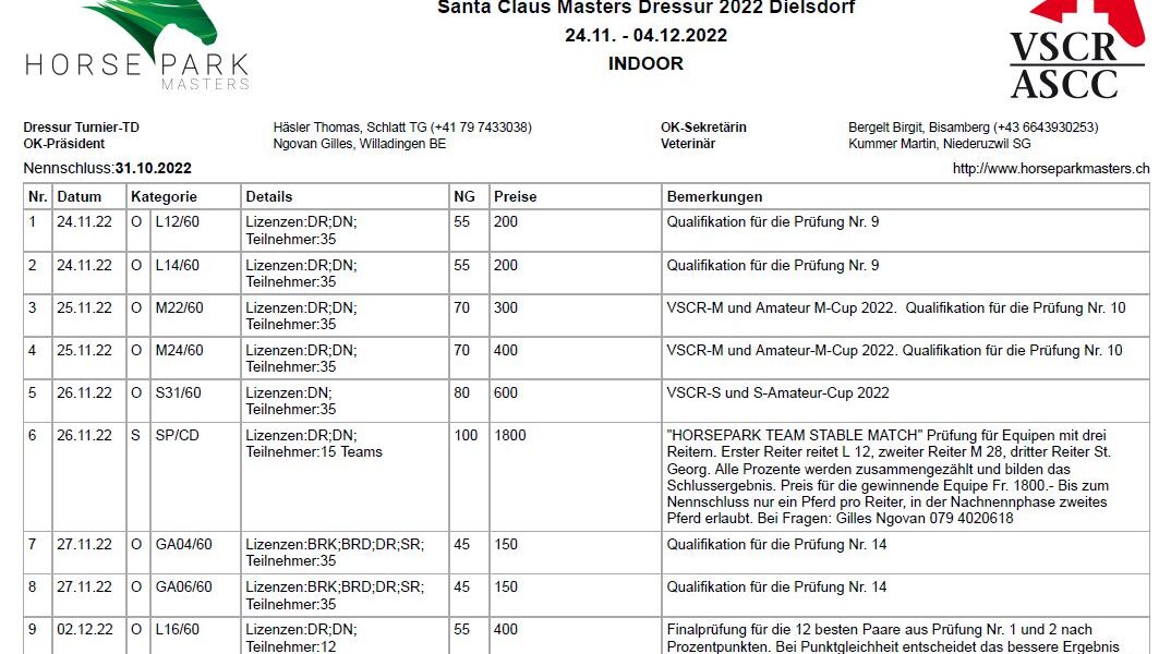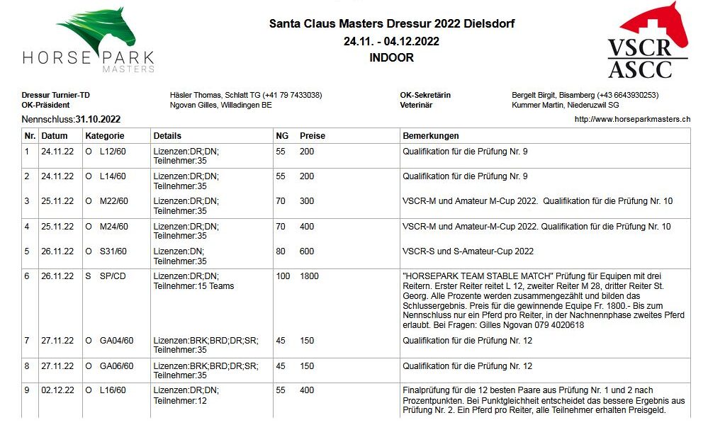 Es wird nicht nur 16 sondern 17 Dressur-Prüfungen am Santa Claus Horse Park Masters 2022 geben! Wir freuen uns, dass wir dank grosszügigen Sponsoren in der Lage sind, Euch am Freitag, 2. Dezember, zusätzlich noch ein Inter II anbieten zu können. Die Ausschreibung ist bereits