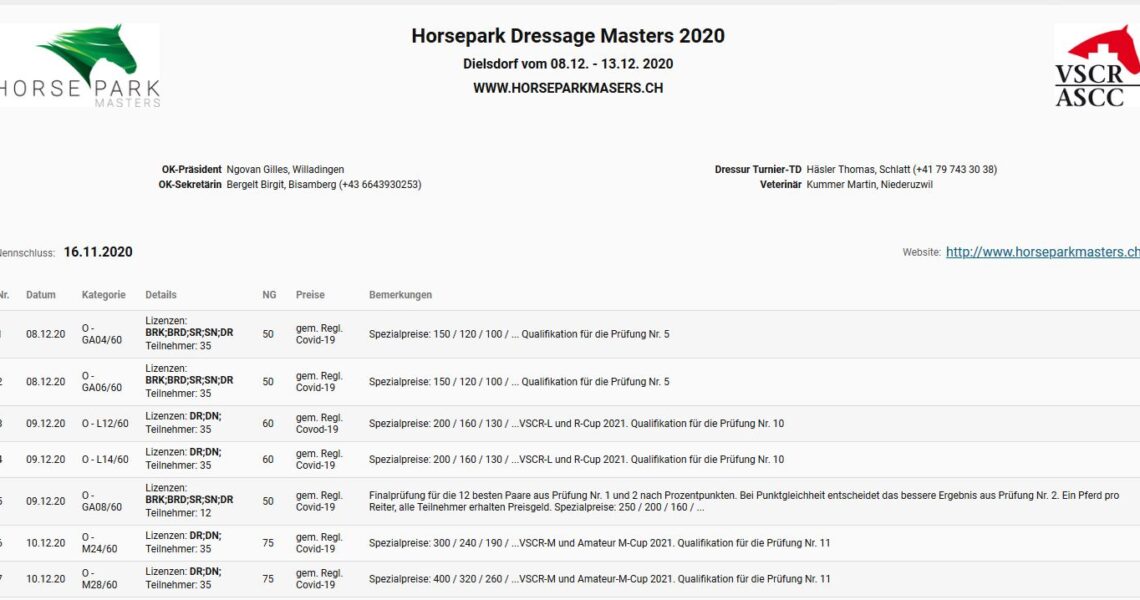 Nach der Ausschreibung für die Springwettbewerbe vom 3. bis 6. Dezember 2020 ist nun auch die Ausschreibung für die Dressur-Prüfungen vom 8. bis 13. Dezember online. Die Reiterinnen und Reiter können je nach Niveau aus 15 attraktiven Wettbewerben wählen – von GA über L, M,