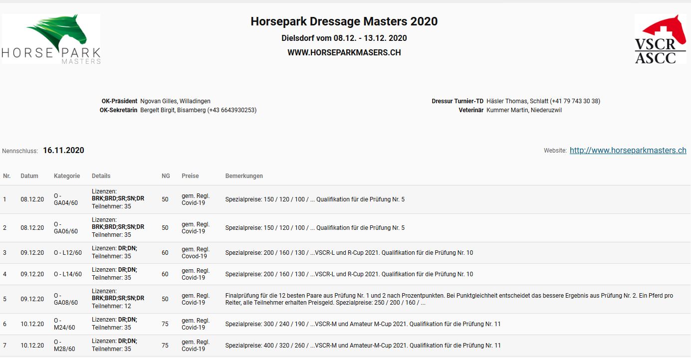 Nach der Ausschreibung für die Springwettbewerbe vom 3. bis 6. Dezember 2020 ist nun auch die Ausschreibung für die Dressur-Prüfungen vom 8. bis 13. Dezember online. Die Reiterinnen und Reiter können je nach Niveau aus 15 attraktiven Wettbewerben wählen – von GA über L, M, bis St. Georg, Inter I und II, Grand Prix und Grand Prix Kür. Ebenfalls wieder auf dem Programm steht die einzigartige Team-Prüfung Stable Match! Nennschluss ist der 16. November – aber am besten heute schon melden, die Nachfrage nach den Startplätzen ist gross!