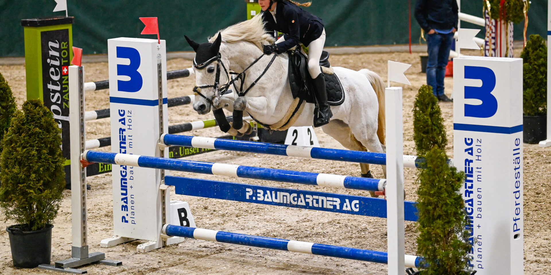 Entschlossen, frech, mit ein bisschen Glück am letzten Oxer, aber erneut fehlerfrei und am schnellsten von allen knapp 60 Teilnehmenden steuerte Grace Bill ihr Schimmelpony über den Parcours im R/N 105, dem Preis der Nexira, Roucen (FRA). Erneut durfte sich die Elfjährige, die einmal Profi-Reiterin werden möchte, zuoberst auf das Siegerpodest stellen und konnte dabei Siegerdecke, Flots, Plakete, Couvert und den riesigen Blumenstraus kaum in den kleinen Händen halten. Hinter ihr tauschten die zweit- und drittplatzierten aus der vorangegangen Prüfung die Plätze: Timo Heiniger aus Stein holte sich mit der jungen Stute Upsala den 2. Rang, Mia Füllemann und ihr Pony Naschko T belegten Rang 3.
