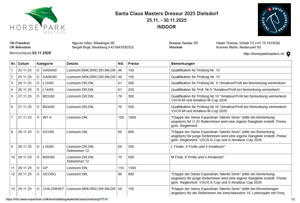 Die diesjährige Jubiläumsausgabe beginnt am 25. November und den Auftakt machen die Dressurreiterinnen und Dressurreiter. Bis und mit Sonntag, 30. November, stehen 19 Prüfungen – vom GA04 bis zur Grand Prix Kür – auf dem Programm.