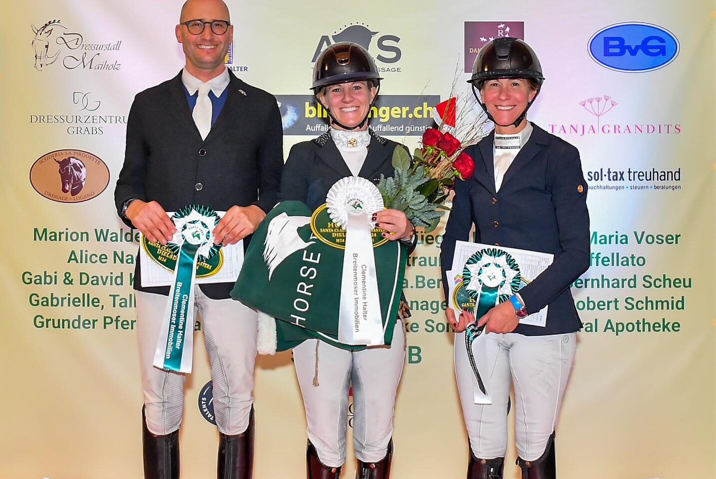 Nach dem M22 gewinnt Melanie Hofmann im Sattel von Robert Lualdis achtjährigem Brando L auch die Folgeprüfung. Im M24, dem Preis des Restaurant Stucki & Frau Tanja Grandits, Basel, erhielt das elegante Paar für seine harmonisch Vorstellung von den Richtern Richter Hans Voser (bei C), Sandra Meier (bei E) und Patricia Regius (bei M) 69,910 Prozentpunkte. Damit gelang Melanie Hofmann mit dem leichtfüssigen Brando L, den sie erst seit dem Frühling unter dem Sattel hat, der zweite Doppelsieg in Folge: Schon in Roggwil vor zwei Wochen gingen die beiden in beiden M als Sieger vom Platz. «Er ist ein bisschen ein Lausbub, macht aber unglaublich viel Freude», sagt sie über den qualitätvollen Youngster, mit dem sie nächstes Jahr den Sprung ins S anstrebt. Zweiter wurde wie in der Vorprüfung Markus Graf mit dem 11-jährigen Descartes mit 69,640 % – und mit seinem zweiten Pferd, der Holländerstute Kaloo B klassierte er sich mit 67,027 % auch gleich noch im vierten Rang. Dazwischen schob sich Isabel Jüstrich, Frauenfeld, die mit Bruno Gassmanns 7-jährigem Westfalen Vote for Me ebenfalls eine schöne Vorführung zeigte, die mit 67,207 % bewertet wurde.