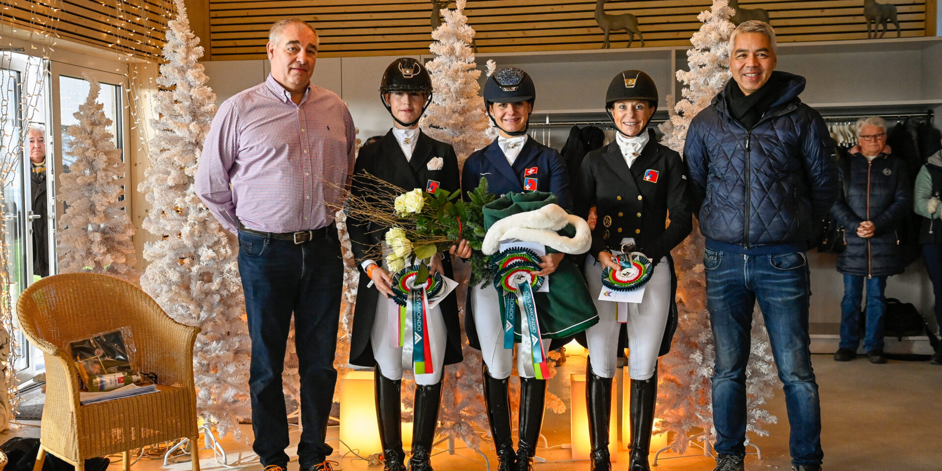 Zurvor erzielte sie mit dem 11-jährigen Oldenburger Quarterboy in der Santa Claus Grand Prix Kür das beste Ergebnis mit 76,475 Prozentpunkten. Alle drei Richter, Barbara Gorsler bei M, Hans Voser bei E und die Deutsche Kerstin Holthaus bei C – sahen die Züricher Oberländerin, die seit kurzem in Freienbach wohnt, auf dem 1. Platz. Sie punkte vor allem in den Traversalen, die sowohl im Trab und Galopp für eine 8 gut waren, ebenso die Wechsel, die Zweier ritt sie sogar einhändig, sowie mit einer soliden PiPa-Tour.