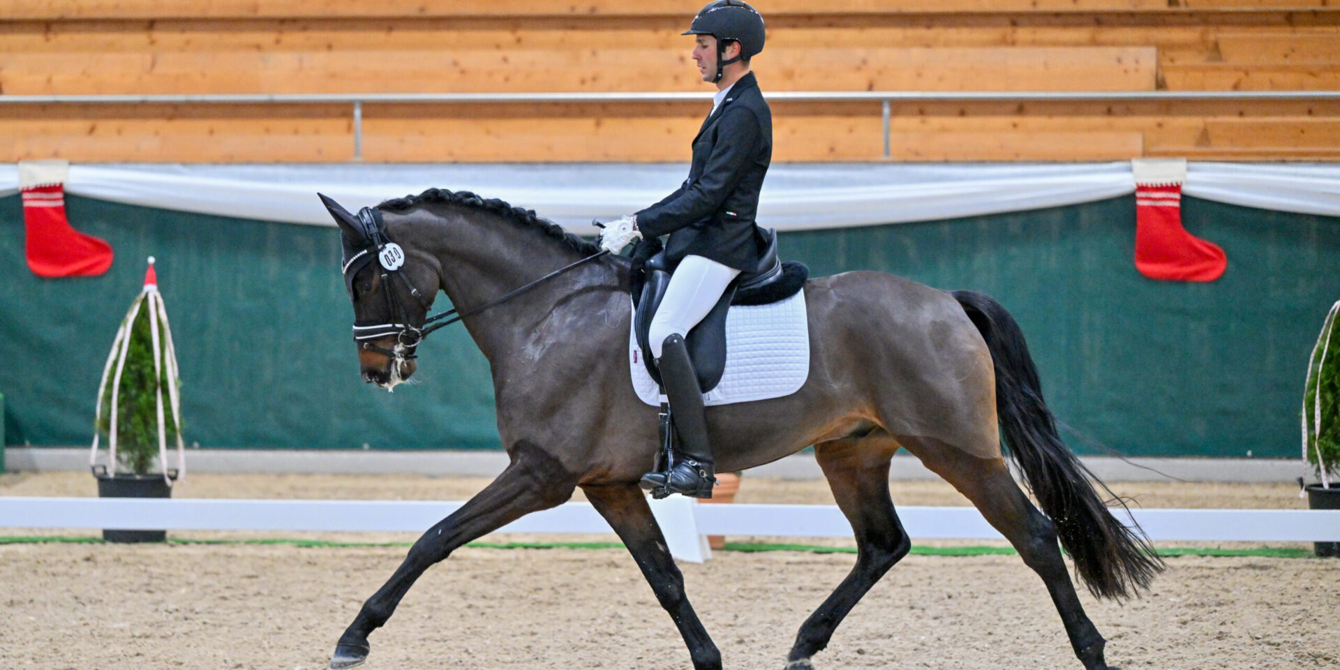 Im L12 am heutigen zweiten Dressurtag am Santa Claus Horse Park Masters, dem Preis der sol-tax treuhand gmbh, Luterbach, dauerte es über vier Stunden, bis der Sieger feststand: 40 Reiterinnen und Reiter hatten sich für diese Prüfung gemeldet, was sowohl von den Richterinnen Viviane Schweizer (bei C), Catherine Jacot (M) und Astrid Müller (E) als auch von den Schreiberinnen viel Ausdauer abverlangte. Sie sahen jedoch spannenden Dressursport und einige vielversprechende Nachwuchspferde. So wie den erst fünfjährigen Hannoveraner Barney Gold TM, der sich für sein Alter bereits sehr abgeklärt präsentierte und alle drei Richterinnen überzeugte: mit dem besten Score der Prüfung von 71,34 % sicherte er seinem Reiter Fabio Tino, Wollerau, den Sieg in dieser Prüfung. Mit zwei Ergebnissen über 69 % kam Olympiareiterin Andrina Suter dem eleganten Paar sehr nahe: Im Sattel der schicken 6-jährigen CH-Stute Querida CH sicherte sie sich mit 69,95 % den 2. Rang – dabei schlug sie sich selber, hatte sie doch zuvor als Startnummer 2 lange mit dem ebenfalls erst sechsjährigen Moreno geführt. Mit dem Hannoveraner-Fuchs erzielte sie 69,09 %. Hinter dem 3. Rang waren die nachfolgenden Platzierungen heiss umkämpft: innerhalb des nächsten Prozentpunkts klassierten sich nicht weniger als 6 Reiterinnen: Esther Andres mit Flamboyant II (68,60%), Luana Niklaus mit Frenkie (68,49%), Meilin Ngovan mit Fiodoro (68,44%), Corin Koch mit Feline von Worrenberg CH (68,39%), Ramona Schmid mit Bendix (68,17%) und Melanie Miesch mit Deichkind (68,01%).