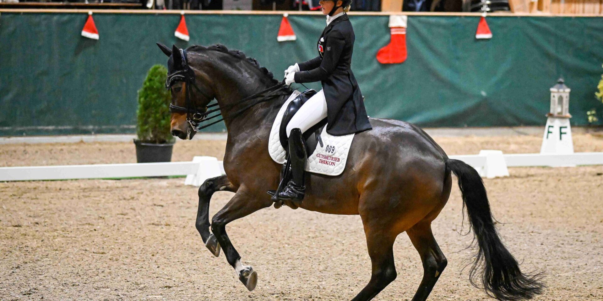 Nach dem Sturz im Training von einem jungen Pferd, bei dem sich Andrina Suter den Oberarm brach, musste die aufstrebende Schaffhauserin pausieren. Für die Grosse Tour am Santa Claus Horse Park Masters bekam sie von ihren Ärzten grünes Licht für den Start mit Robert Lualdis Fibonacci III – und besser hätte das Comeback nicht gelingen können: Andrina Suter und Fibonacci III gingen mit 73,32 Prozentpunkten als Sieger im Preis vom Stall Kranz, Sevelen, vom Platz. Der 31-jährigen Schaffhauserin scheinen die Wettkämpfe gefehlt zu haben: sie ritt auf Angriff und vorwärts, was Fibonacci erlaubte, sich schön zu tragen. Der 13-jährige Westfale zeiget die besten Piaffen im GP-Starterfeld und eine starke Galopptour. Einzige ein Zählfehler in der ZickZack-Traversale gab einen empfindlichen Punkteabzug.