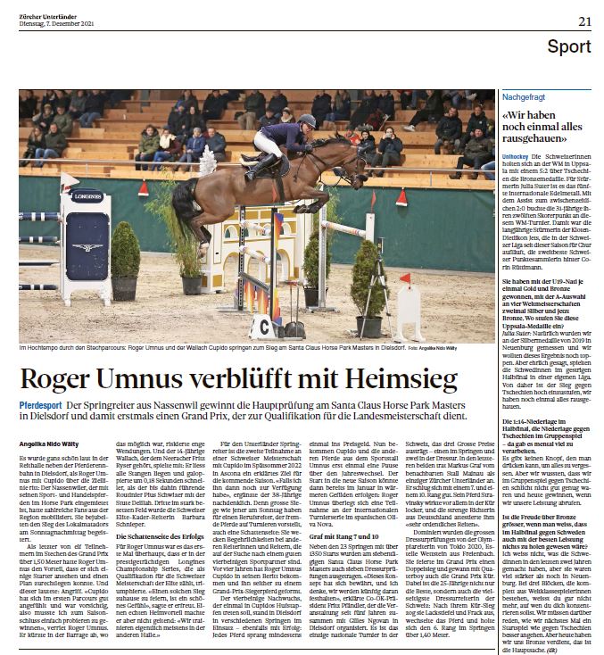 Grand-Prix-Sieger Roger Umnus ist im Zürcher Unterland aufgewachsen und hat seinen Sportstall in Horse Park in Dielsdorf eingemietet – damit ist er ein „waschechter“ Einheimischer und sein Sieg vom Sonntag der Tageszeitung „Zürcher Unterländer“ natürlich eine Schlagzeile und einen grossen Artikel wert.