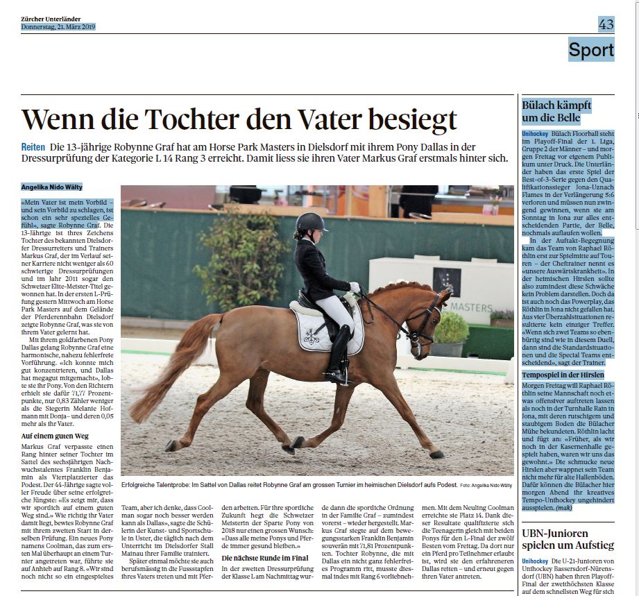 In den L-Prüfungen gestern am Horse Park Masters schlug die 13-jährige Robynne Graf zum ersten Mal ihren Vater Markus Graf – und heute stehts schon in der Zeitung… Der Zürcher Unterländer, Medienpartner des Horse Park Masters 2019, brachte heute im Sportteil diesen Artikel.
