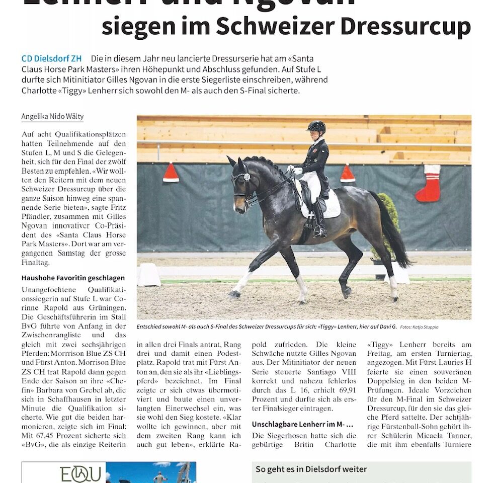 Unser Medienpartner, die PferdeWoche, berichtet in ihrer heutigen Ausgabe vom ersten Turnierwochenende am Santa Claus Horse Park Masters 2023. Auf den Seiten 10 und 11 findet Ihr alles über die spannenden ersten Höhepunkte: die ersten Finals im Schweizer Dressur Cup 2023.