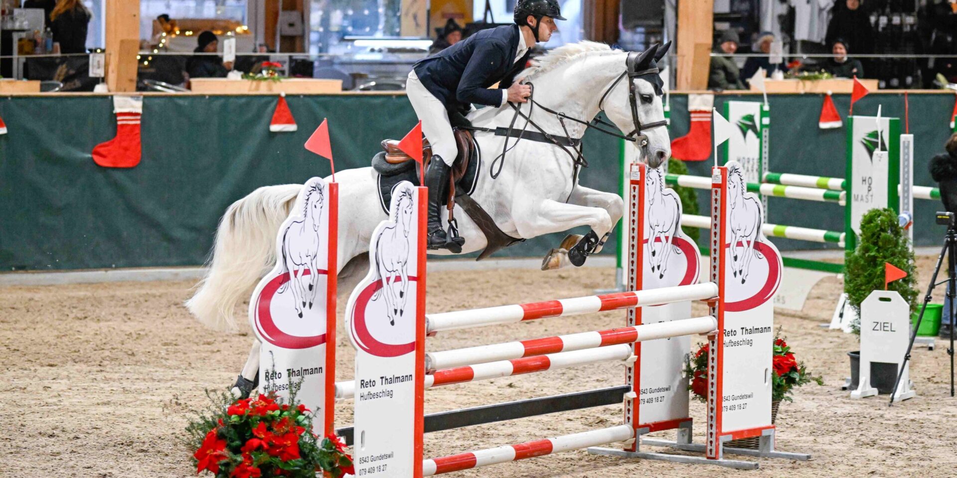 Eine weitere spannende Springprüfung ist am Santa Claus Horse Park Master zu Ende gegangen. Im Preis der Eckert Transport AG, Koblenz, erwies sich Dominik Juffinger aus Galgenen als unschlagbar: Im Sattel von Caluno A, einem 9-jährigen Westfalen erzielte er in dem Springen über 1.15 Meter nach Wertung A mit Zeitmessung fehlerfrei die schnellste Zeit. Im dicht auf den Fersen war Roland Grimm aus Niederbüren im Sattel der talentierten jungen Eloise II, auch sie westfälischer Abstammung. Dritter wurde Moreno Pichierri aus Seon mit dem sechsjährigen CH-Pferd Chandor CB CH-