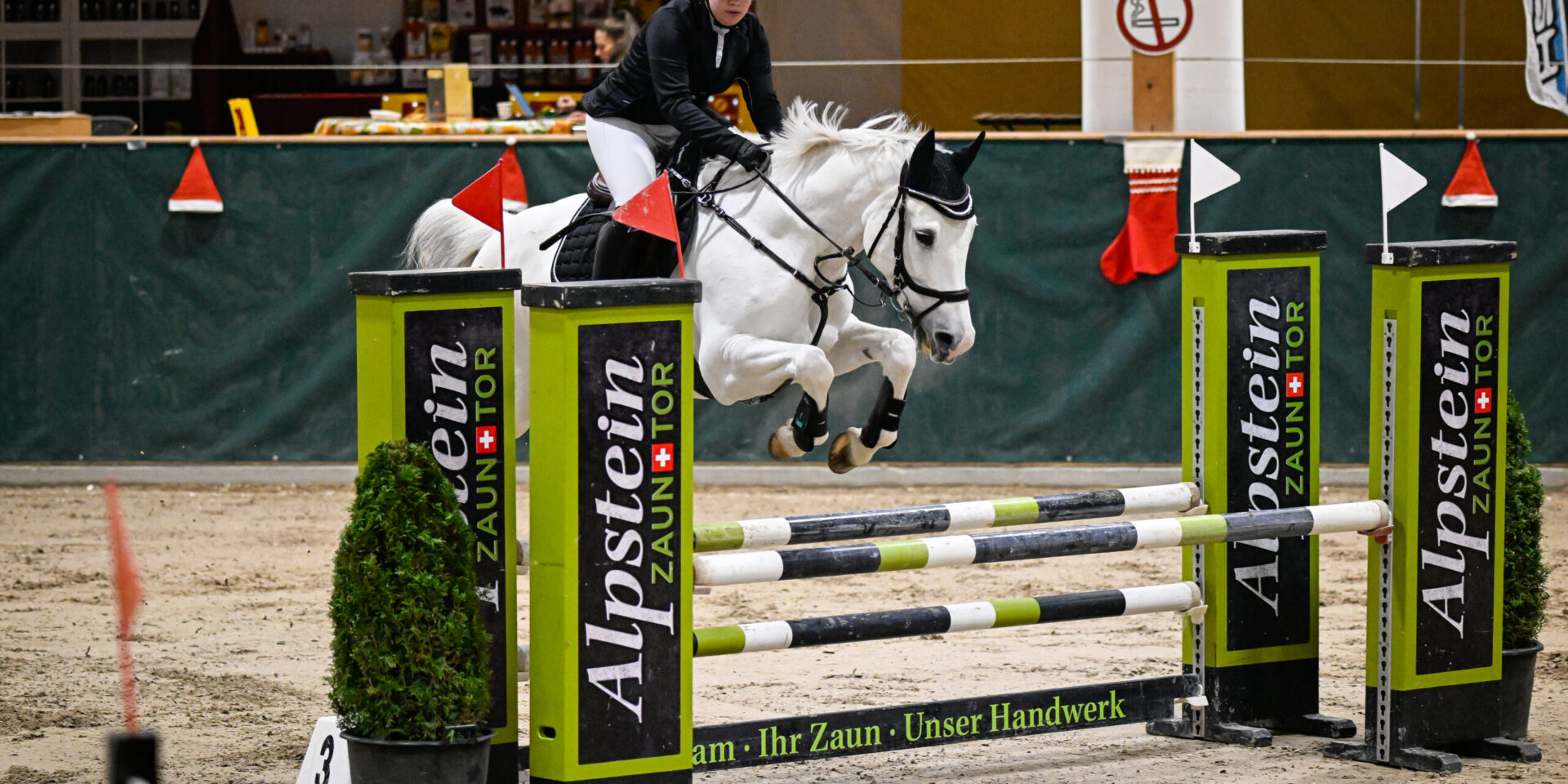 Für die Reiterinnen und Reiter der Kategorie B/R90 und 95 hiess es früh aufstehen heute am neunten Turniertag des Santa Claus Horse Park Masters 2022: bereits um 7 Uhr ertönte das erste Startzeichen. Definitiv schon ausgeschlafen hatte Michelle Andermatt aus Neuägeri: sie pilotierte die 11-jährige Schimmelstute Pippa de Fontanelle CH fehlerfrei und am schnellsten (in 52,30 Sekunden) durch den Parcours im Preis von Dr. Peter Brunner, Rüschlikon. Mit ihrem schnellen Palomino-Pony Caspian sprang Robine Kälin aus Ebertswil auf dem 2. Rang. Dritte wurde Elina Bamberger aus Kleindöttingen mit Green’s Sheherazade vor Joy Kanitz aus Wil mit Capitano und Fabio Hartmann, Eggersriet mit Vospero de Qo.