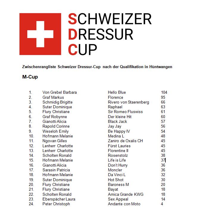 Nach Balsthal, der sechsten von acht Qualifikationen im neuen Schweizer Dressur Cup führt in der Kategorie L Corinne Rapold mit ihrem beiden Pferden Morrison Blue ZS CH (170 Punkte) und Fürst Anton (126) vor Brigitta Schmidig mit Zaphira (110). Für den grossen Final, der am Samstag, 25. November, im Rahmen des Horse Park Masters in Dielsdorf stattfindet, wird sich Corinne Rapold entscheiden müssen: nur ein Pferd ist am Schlusstag startberechtigt. Auch in der Kategorie M kommt die Führende aus Grüningen: Barbara von Grebel hat mit Hello Blue (140 Punkte) einen grossen Vorsprung auf Brigitta Schmidig mit Rivero von Staerenberg (104) und Markus Graf mit Florence (95). In der Kategorie S liefern sich Charlotte Lenherr mit Davi G und Christiane Flury mit Sir Romeo Fluswiss ein Kopf-an-Kopf-Rennen um die Führung: beide haben aktuell 129 Punkte auf ihrem Konto. Dritte ist aktuell Melanie Hofmann mit For Fun.