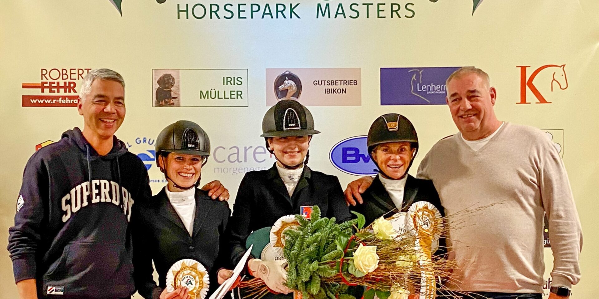 Es wurde gegen Ende der Prüfung noch einmal so richtig spannend, im M24/60, dem Preis der Familie Josef Stadler, Grüningen. Charlotte Lenherr hatte mit Fürst Lauries H mit 69,459 % schon einmal gut vorgelegt und führte bis zur Hälfte der Prüfung. Dann wurde sie von der Jüngsten im Starterfeld verdrängt. Der kleine Hit erwies sich heute unter der Dielsdorferin Robynne Graf als grosser Hit und das Paar ging mit 70,631 Prozent an die Spitze. Dann sah es eine Weile so aus, als ob die zweitletzte Starterin, Lisa Astfalk mit dem 7-jährigen Hannoveraner Zinedine II das junge Talent noch abfangen konnte – was dann aber mit 70,315 Prozentpunkten nicht ganz reichte. Also waren alle Augen auf die letzte Starterin und Gewinnerin des M22/60, Tiggy Lenherr mit Davi G gerichtet. Der leichtfüssige Dunkelbraune (im Besitz von Vera Markert Rüegg und Erich Rüegg) zeigte erneut ein tolles Programm, das zwei der drei Richterinnen auch auf dem ersten Platz sahen, da das dritte Wertungstotal aber tiefer lag, vermöchte die WM-Teilnehmerin nicht an Robynne Graf vorbei zu ziehen, sondern musste mit Platz 2 vorlieb nehmen. Bei der Ehrung gesellten sich die OK-Präsidenten Gilles Ngovan und Fritz Pfändler zu den drei Siegerinnen auf dem Podest.