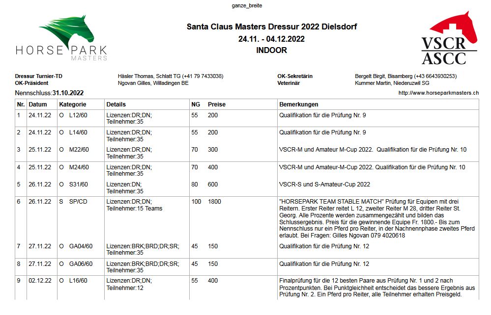 Also, nenne am besten bald und sichere Dir Deine Starts im einmaligen vorweihnachtlichen Ambiente des festlich dekorierten Horse Park in Dielsdorf ZH.