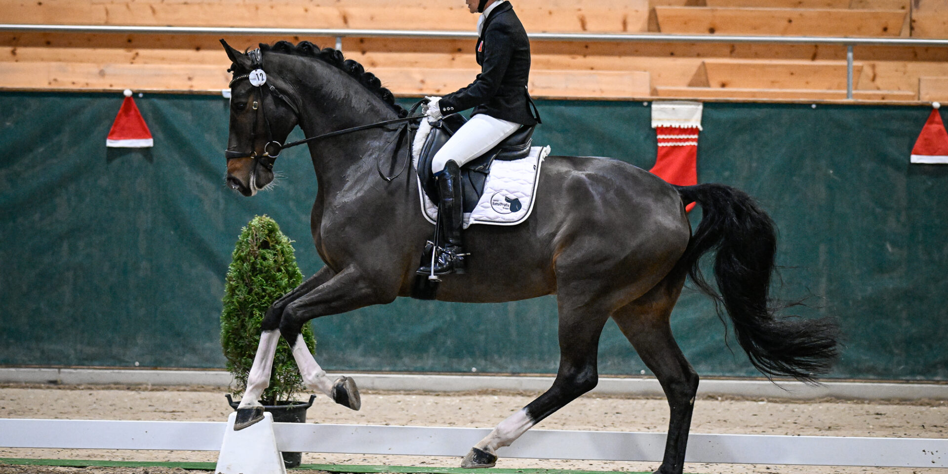 Was für ein tolles Pferd für die Zukunft: der 7-jährige Oldenburger Davi G, im Besitz von Vera Markert Rüegg, Rapperswil und gekonnt vorgestellt von der erfahrenen Elitekaderreiterin Tiggy Lenherr aus Pfyn, gewinnt überlegen den M-Final am Santa Claus Horse Park Masters, den Preis von CarePlus Morgenegg, Frauenfeld. Das elegante Paar wurde von allen fünf Richterinnen und Richtern auf Platz 1 gesehen und erhielt ein beeindruckendes Ergebnis von 72,195 Prozentpunkten. Spannend wurde es dann um die Plätze dahinter: die folgenden 5 Reiterinnen und Reiter lagen alle innerhalb eines Prozentpunktes dicht beieinander. Mit 67,805 % sichterte sich Ronald Scholten aus Rifferswil mit dem schön präsentierten Rosenstolz III den zweiten Rang vor Fabio Tino, Wollerau mit Golden Sare TM (67,512%). Der 4. Rang ging an Martina Flury mit Freddie Frinton (67,366%) vor Meret Wehrli Eser aus Zürich mit Diablo CH (67,244 %).